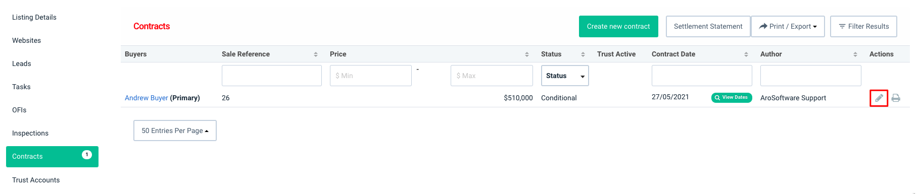 - If you need to update the contract again to Unconditional or Settled, simply go into the Contracts tab again and click on the Edit pen on the right
