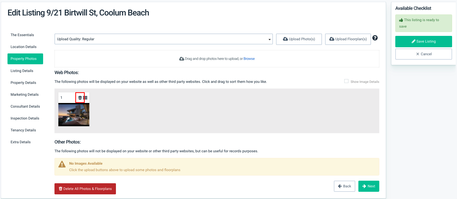 - To delete a photo or floorplan, simply click on the trash icon on the image
