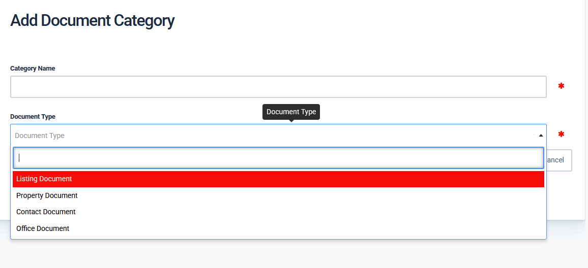 Document Categories can be accessed from Documents Tab on any Listing , Contact, or Office Documents.