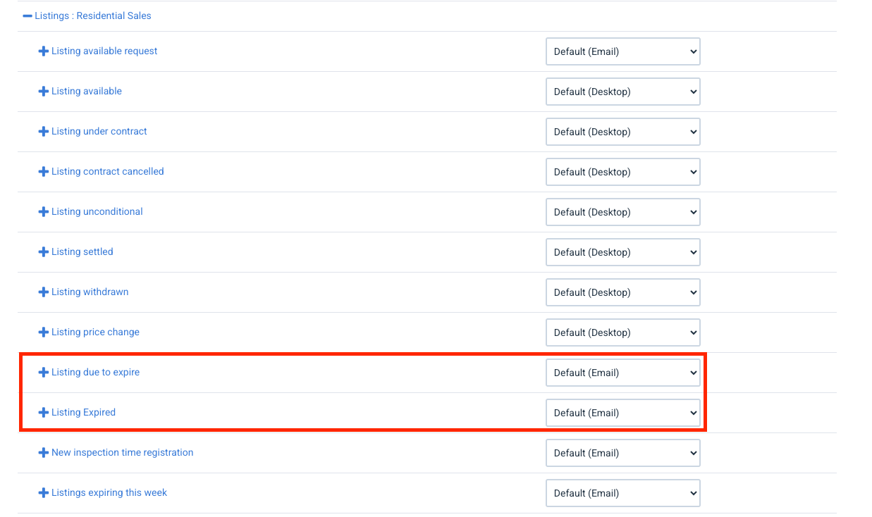 - In the dropdown menu for Listings due to expire and Listing Expired, you can choose your preferred notification method
