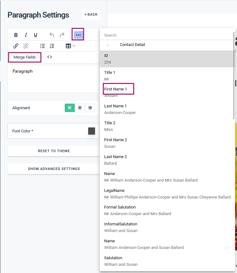 - Select the merge field you’d like to use (e.g. First Name, Last Name, etc.) to insert into the paragraph text section.